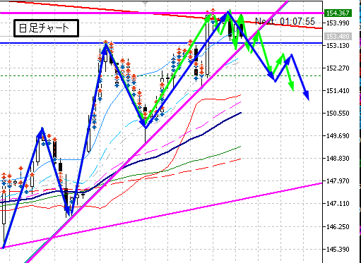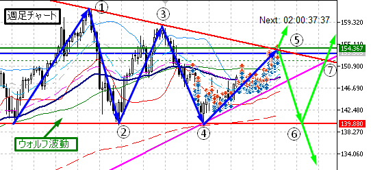 - 153円〜150円のレンジを目指す中期的な調整波が始まる可能性が高いです。
