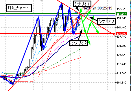 - 上記理由から、介入を警戒し154円前半での強い売りが何回も発生している為、月足のチャネル上限値を明確に超えれない状況なので、徐々に下がっていくと考えるのが自然です。