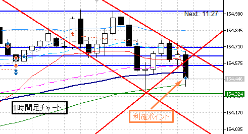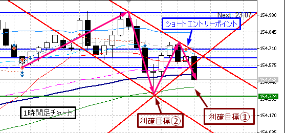 今回の利確目標としては、スイングトレードするならば、「チャネル内下限値のちょい手前(おそらく154.040くらい)」は狙えるケースです。
