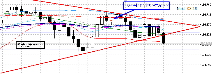 では、5分、15分では三角フラッグ内での推移している最中なのにその前にショートでエントリーしている図になっている事に気が付いたでしょうか?